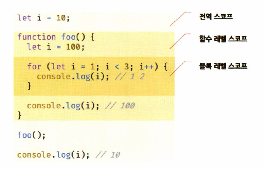 var 키워드로 선언한 변수는 오로지 함수의 코드 블록만을 지역 스코프로 인정하는 함수 레벨 스코프를 따른다. 하지만 let 키워드로 선언한 변수는 모든 코드 블록(함수, if, for, while try/catch문 등)을 지역 스코프로 인정하는 블록 레벨 스코프를 따른다.