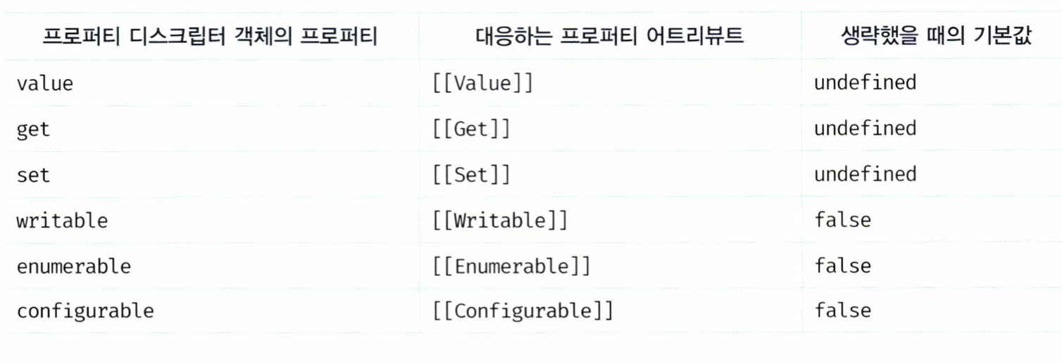 const person = {} Object.defineProperty(person, 'firstName', { value: 'Daniel', writable: true, enumberable: true, // 열거 가능 여부, for, Object.keys() configurable: true // 키 삭제 가능 여부 }) // 디스크립터 객체의 프로퍼티를 누락시키면 value는 undefiend, 속성은 false가 기본값 Object.defineProperty(person, 'lastName', { value: 'Park', }) Object.defineProperty(person, 'fullName', { get fullName() { return `${this.firstName} ${this.lastName}` }, set fullName(name) { [this.firstName, this.lastName] = name.split(" "); }, enumerable: true, configurable: true, })[표 16-03]
