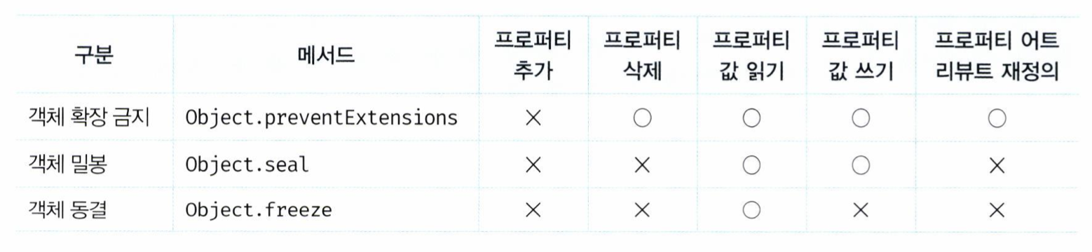 자바스크립트는 객체의 변경을 방지하는 다양한 메서드를 제공한다. 객체 변경 방지 메서드들은 객체의 변경을 금지하는 강도가 다르다.