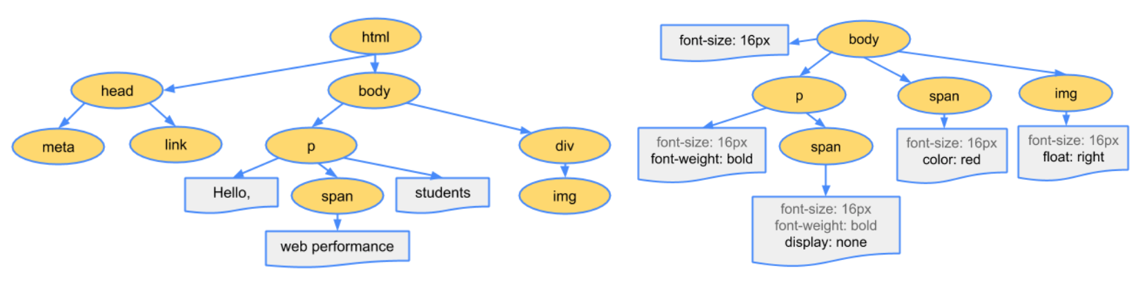 그림3. DOM(좌) CSSOM(우)을 시각화 한 그림 렌더링 엔진은 서버로부터 HTML 문서를 받아서 파싱하고 DOM(Document Object Map) 트리로 변환한다. 그 다음 CSS 파일과 함께 포함된 스타일 요소를 CSSOM(CSS Object Model) 트리로 파싱한다.
