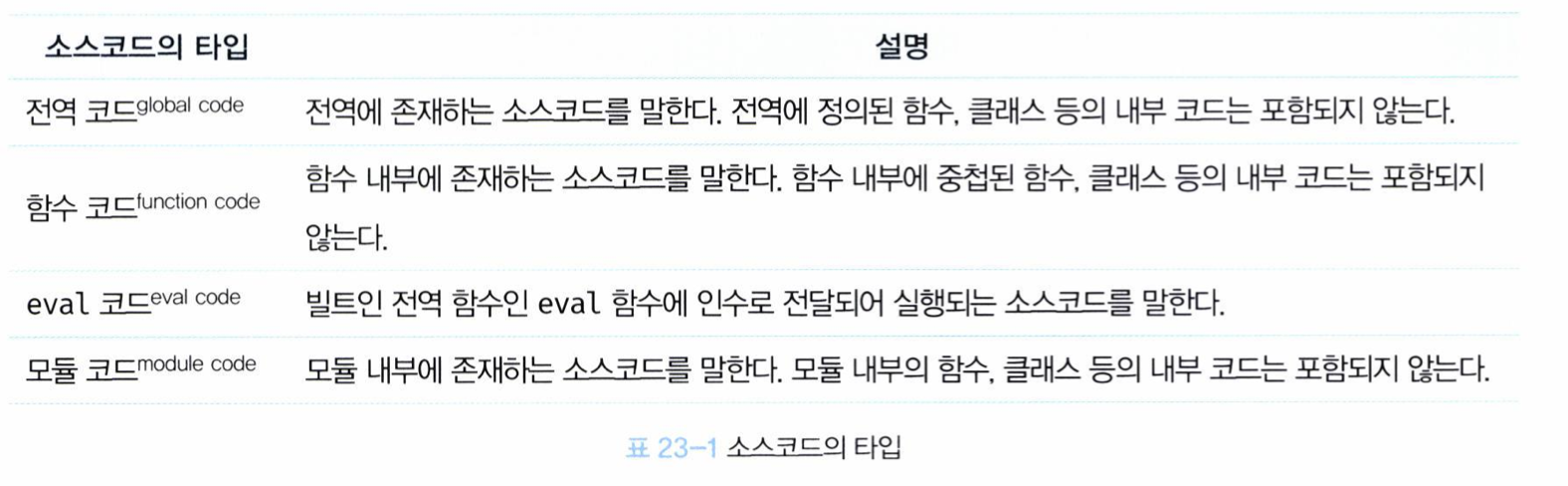 - 또한 함수 호출이 종료되면 함수 호출 이전으로 되돌아가기 위해 현재 실행 중인 코드와 이전에 실행하던 코드를 구분하여 관리해야 한다. 이처럼 코드가 실행되려면 다음과 같이 스코프, 식별자, 코드 실행 순서 등의 관리가 필요하다.