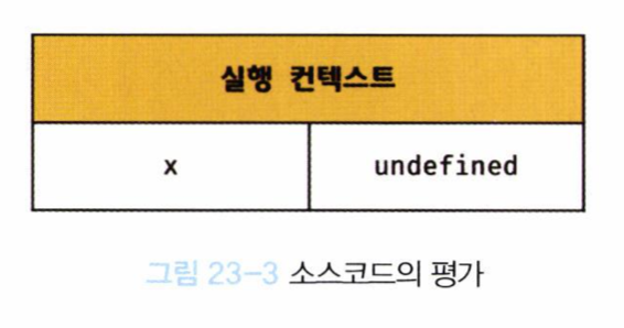 var x; x = 1;자바스크립트 엔진은 위 예제를 2개의 과정으로 나누어 처리하게 된다. 먼저 소스코드 평가 과정에서 변수 선언문 var x;를 먼저 실행한다. 이때 생성된 변수 식별자 x는 실행 컨텍스트가 관리하는 스코프에 등록되고 undefined로 초기화된다.