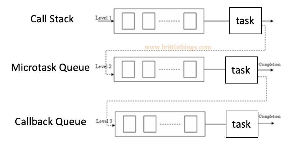 그림1. 다단계 큐(Multi-level Queue) 출처: www.brittlethings.com Javascript도 작동방식이 완벽히 같지는 않지만, 동시성(Concurrency)를 지원하기 위해 이 스케쥴링 방법에서 아이디어를 얻은 듯 하다. 본격적으로 Javascript의 방식에 대해서 알아보도록 하겠다.