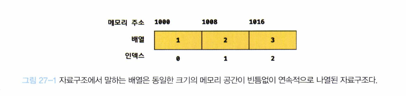 자료구조에서 말하는 배열은 동일한 크기의 메모리 공간이 빈틈없이 연속적으로 나열된 자료구조를 말한다. 즉, 배열의 요소는 하나의 데이터 타입으로 통일되어 있으며 서로 연속적으로 인접해 있다(밀접 배열)