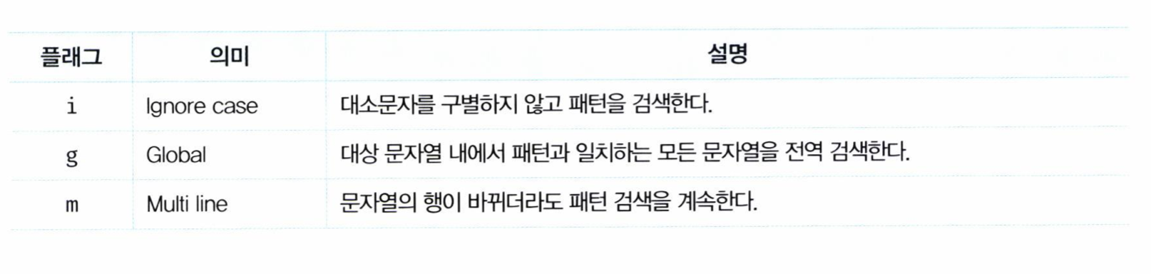 이처럼 정규 표현식 리터럴은 패턴과 플래그로 구성된다.