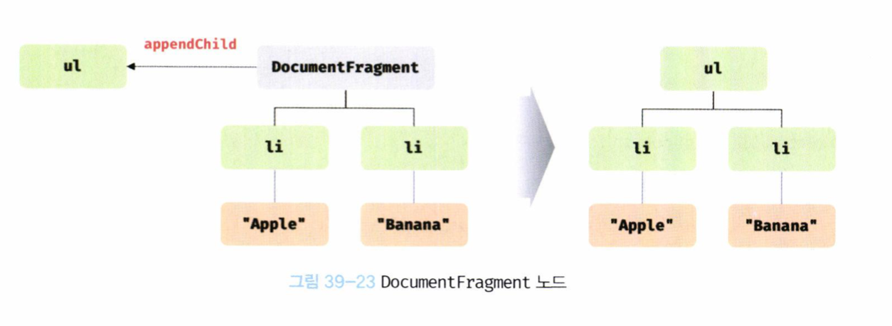 (생략) <body> <ul id="fruits"></ul> </body> <scripts> const $fruits = document.getElementById('fruits'); //DocumentFragment const $fragment = document.createDocumentFragment() ['A, 'B', 'C'].foreEach(text => { // 1. 요소 노드 생성 const $li = document.createElement('li') // 2.텍스트 노드 생성 const textNode = document.createTextNode(text) // 3 텍스트 노드를 $li 요소 노드의 자식 노드로 추가 $li.appendChild(textNode) // 4 $li요소 노드를 DocumentFragment 노드의 마지막 자식 노드로 추가 $fragment.appendChild($li) }) //5 DocumentFragment 노드를 #fruits 요소 노드의 마지막 자식 노드로 추가 $fruits.appendChild($fragment) (생략)[그림 39-12]