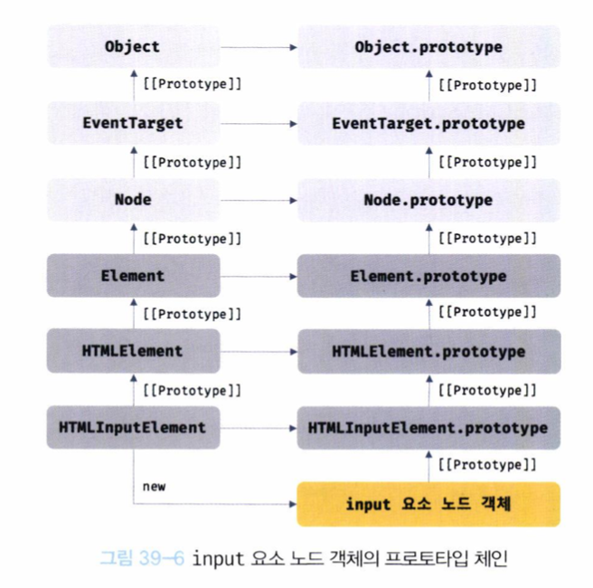 예를 들어, Input 요소 노드 객체는 프로토타입 체인에 있는 모든 프로토타입의 프로퍼티나 메서드를 상속받아 사용할 수 있다. 노드 객체의 상속 구조는 아래처럼 개발자 도구의 Elements 패널 오축의 Properties 패널에서 확인할 수 있음.[그림 39-06]