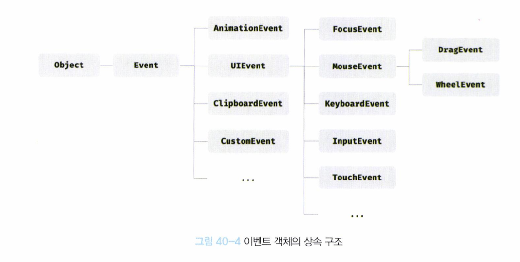 ... <!-- 이벤트 핸들러 어트리뷰트 방식의 경우 event가 아닌 다른 이름으로는 이벤트 객체를 전달받지 못한다. --> <body onclick="showCoords(event)"> </body> ...40.5.1 이벤트 객체의 상속 구조