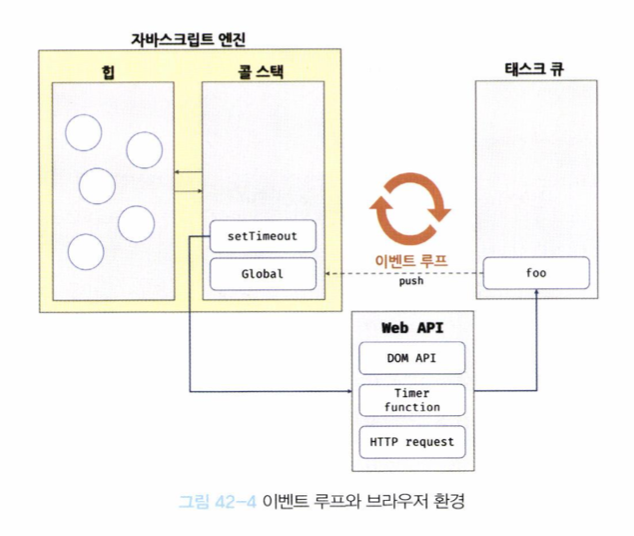 비동기 처리에서 소스코드 평가와 실행을 제외한 모든 처리는 JS엔진을 구동하는 환경인 브라우저 또는 Node.js가 담당한다. 예를 들어, 비동기 방식으로 동작하는 setTimeout의 콜백 함수의 평가와 실행은 JS엔진이 담당하지만 호출 스케줄링을 위한 타이머 설정과 콜백 함수의 등록은 브라우저 또는 Node.js가 담당한다.